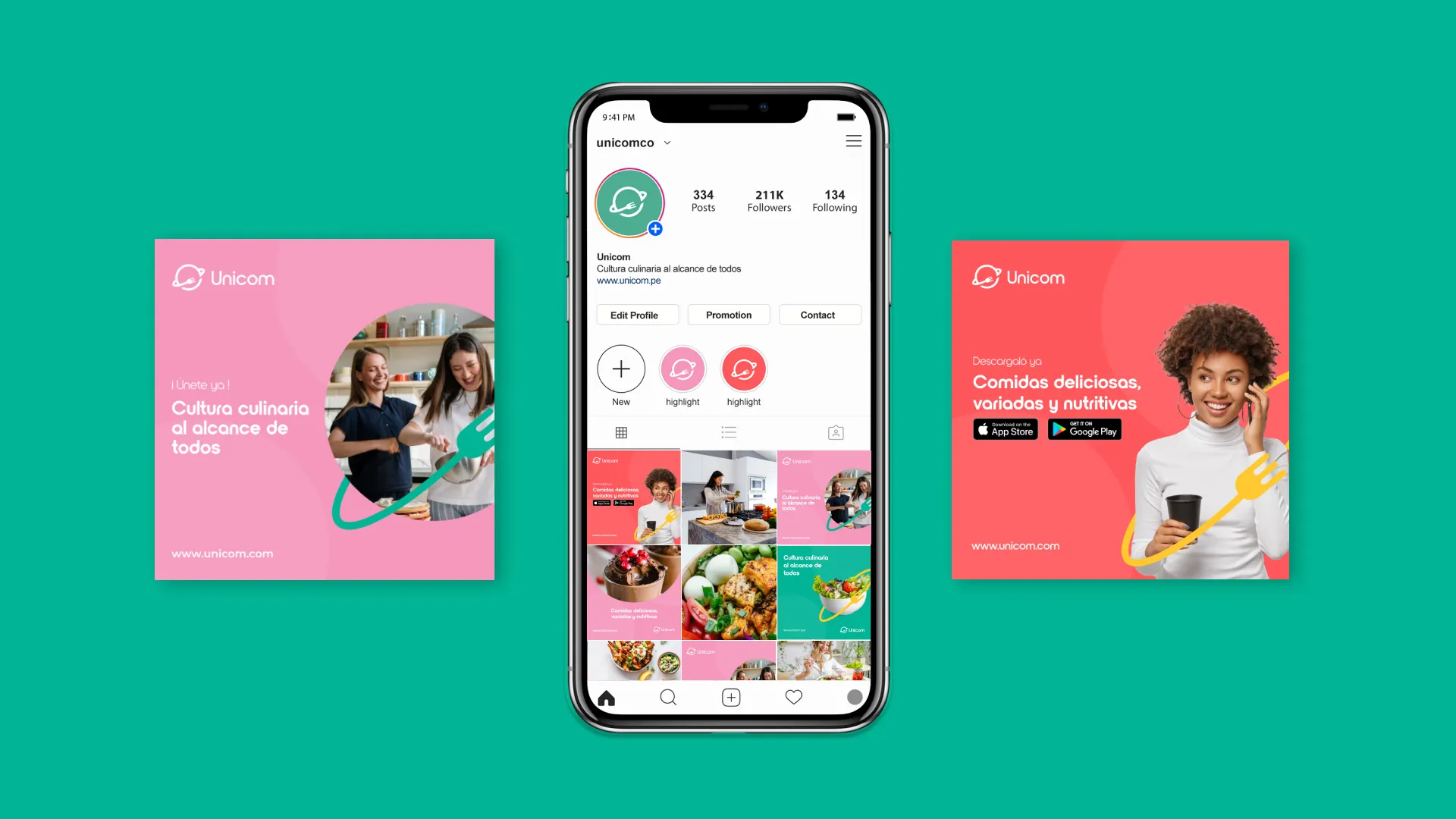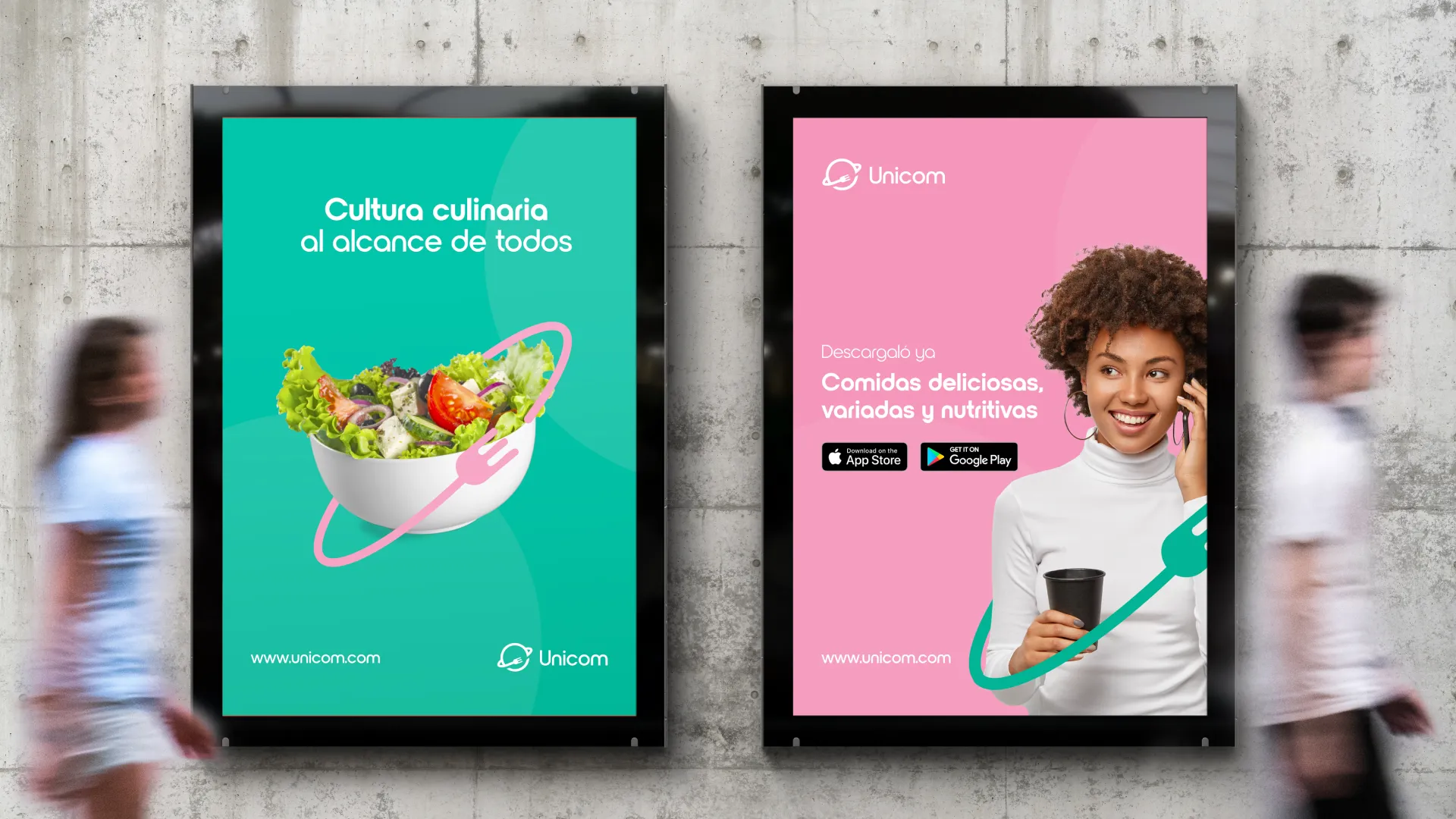 El desarrollo de la identidad visual de Unicom se orientó a reflejar claridad, diversidad y accesibilidad, valores que son centrales en su oferta de servicios. La construcción del sistema visual busca transmitir un enfoque inclusivo, confiable y versátil que conecte con usuarios con diferentes necesidades dietéticas y estilos de vida.